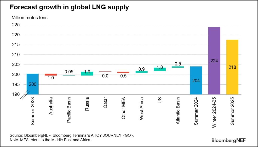 Bloomberg estimates just a 2% growth in LNG supply on summer-over-summer basis, driven by production increases in Russia and the United States. However, growth in supply from summer 2024 to summer 2025 is seen at almost 7% due to new production projects going live. Source: Bloomberg Finance LP