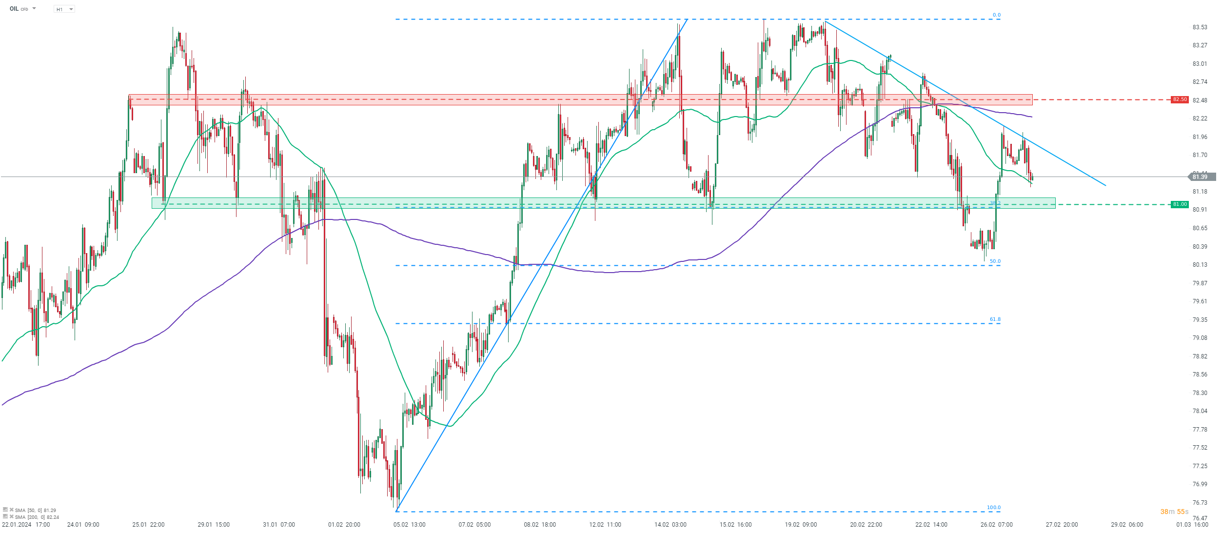 Brent (OIL) pulls back after making another failed attempt at breaking above a short-term, downward trendline. Price is currently testing 50-hour moving average (green line), which is a final hurdle ahead of the $81 support zone, marked with 38.2% retracement. A break below this area may hint that another test of the $80 area is looming. Source: xStation5