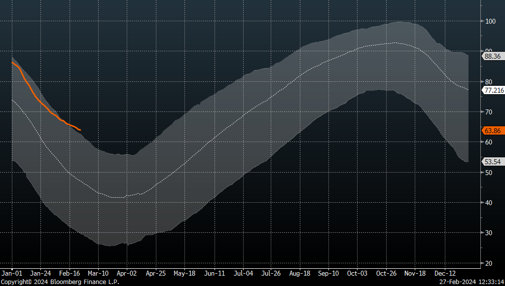 - Seasonal pattern suggest that we may be approaching a local peak. A small correction cannot be ruled out later on, until around March 10, 2024, after which 2-3 months of sideways trading should commence