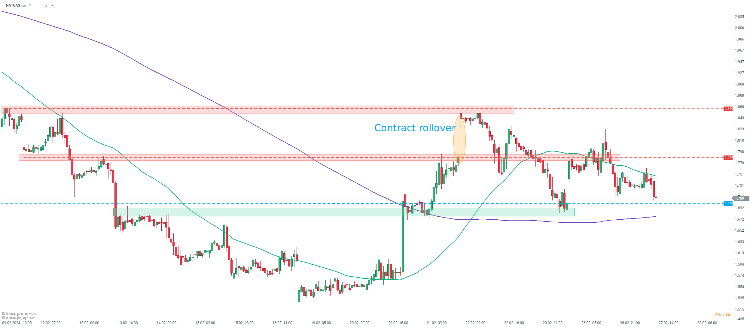 US natural gas prices (NATGAS) have been trading mostly sideways following recent contract rollover. Price is approaching the $1.70 per MMBTu area that has served as a floor over the past week. Source: xStation5
