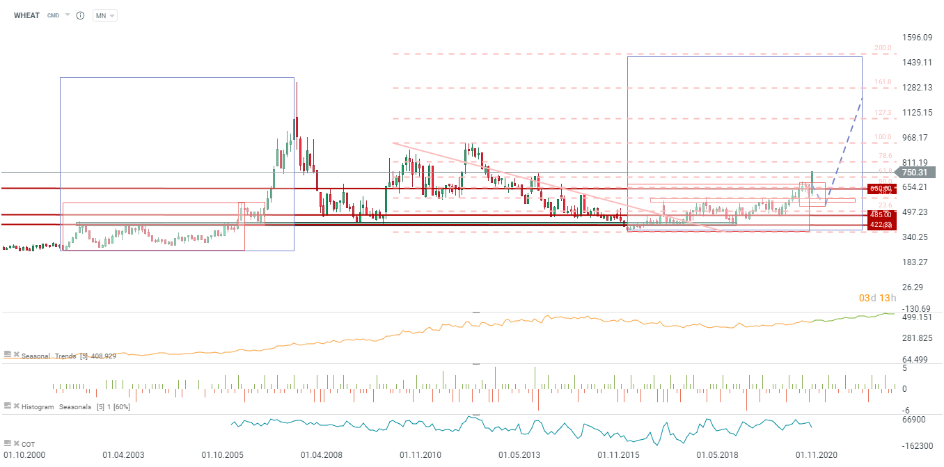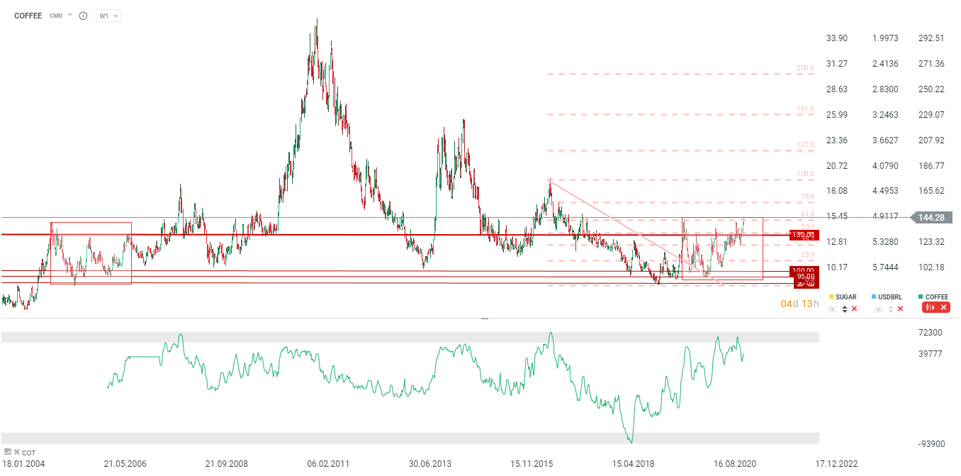 Wheat price jumped above a recent trading range. A point to note is that positioning is not extremely high. Price sits at the highest level since February 2013. 820 cents per bushel can be seen as the next potential resistance level to watch (78.6% retracement). Source: xStation5