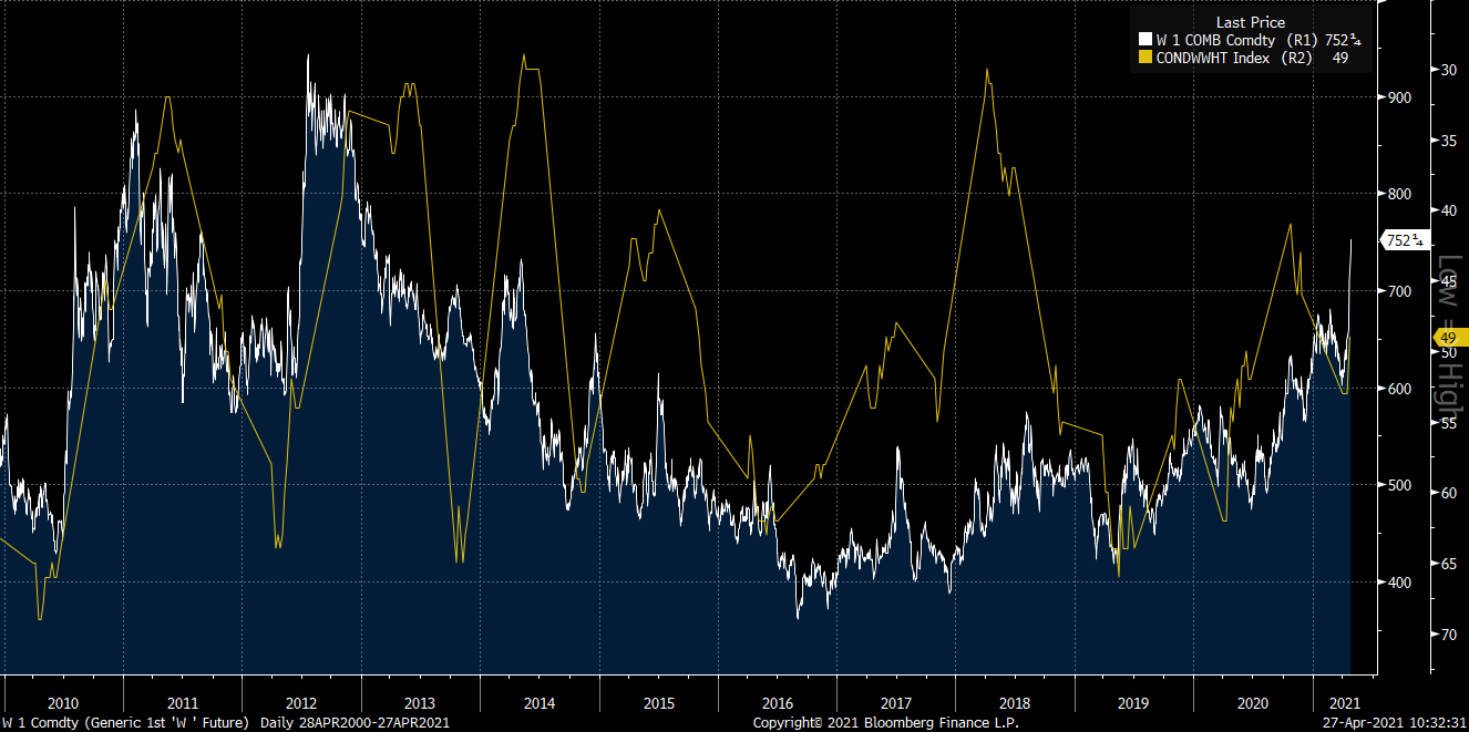 Crop quality in the United States has been deteriorating since the beginning of this season. On the other hand, quality remains relatively high in historical terms. In any case, production in the United States is expected to be limited and recent weather conditions seem to support higher prices. Source: Bloomberg
