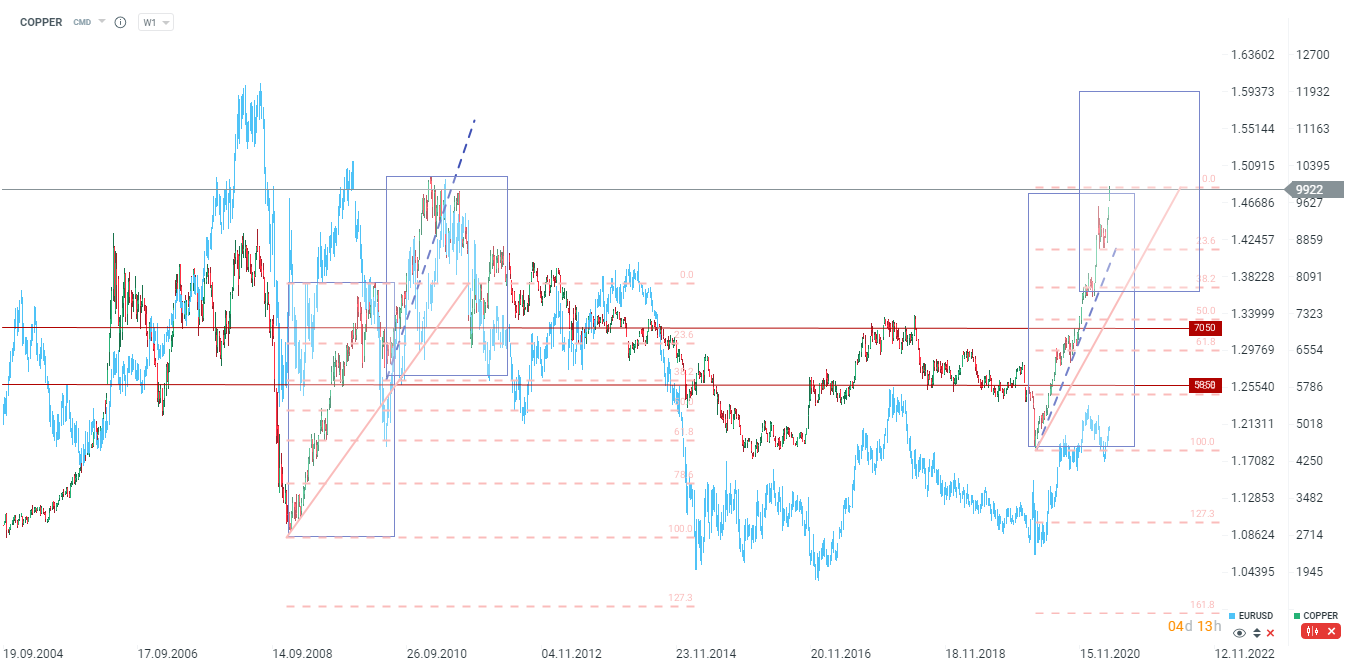 Should the history repeat itself, copper could in theory rally towards $12,000 per tonne over the 24-26 month period starting with last years' local low. This would hint at the $12,000 mark being reached near mid-2022. However, back in 2008-2011 period, copper price gains were supported by weak USD. Currently, the US dollar remains expansive in historical terms. Source: xStation5