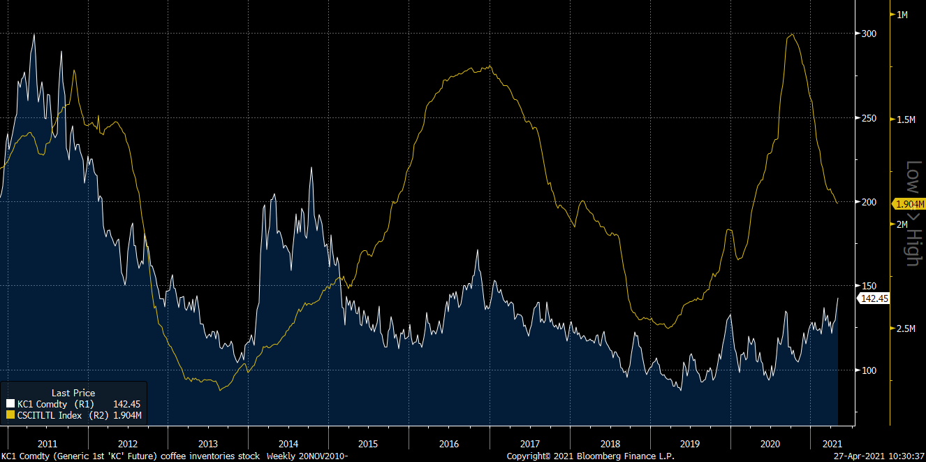 Coffee dealers expect crops to be slightly lower this year while demand from US and Europe is expected to rise amid reopening of bars and restaurants