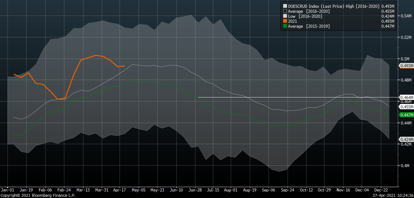 US oil stockpiles remain slightly below 500 million barrels. OPEC+ is using average for 2015-2019 as a reference point. In order to reduce pandemic-related oversupply, stockpiles would need to drop to 464 million barrels by the end of June. This translates into stockpiles dropping by 3 million barrels per week on average. Source: Bloomberg