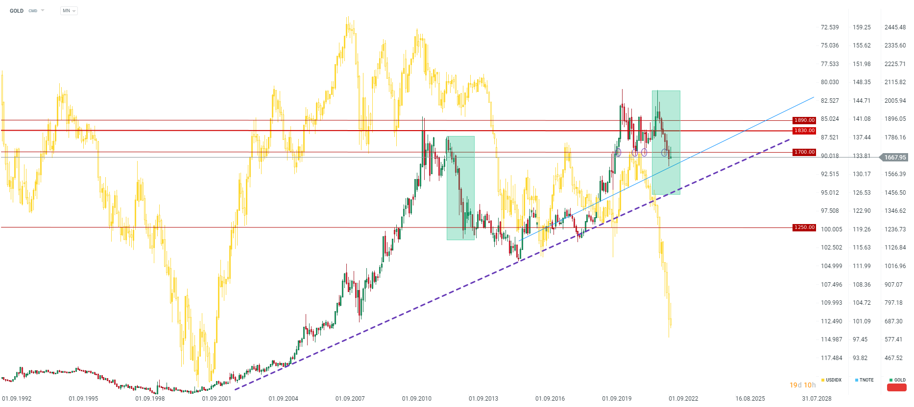 USD dollar rally that took place at the end of previous millenia led to an around 40% drop in gold prices. Unless we see a change in the situation on US dollar market, gold may see a deeper sell-off, with $1,500 and $1,250 being key levels to watch. Source: xStation5