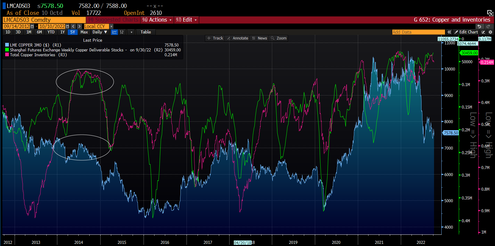 Copper stockpiles in 2014 were very low but it did not stop prices from falling significantly. Similar situation could be playing out now. Source: Bloomberg