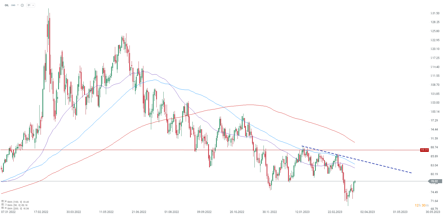 Oil recovered significantly but currently struggles to break above the lower limit of a previously broken trading range. Source: xStation5