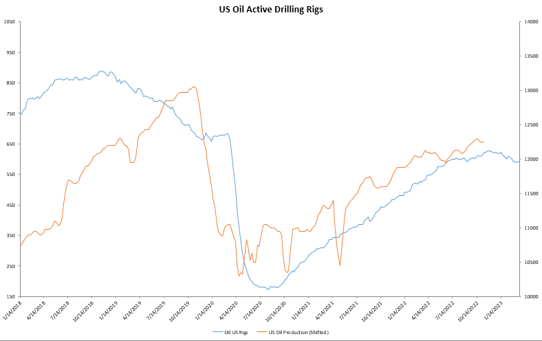 OPEC+ did not react to a recent plunge in crude prices. On the other hand, comparing number of active oil drilling rigs in the United States and US oil production shows that output peak may be nearing