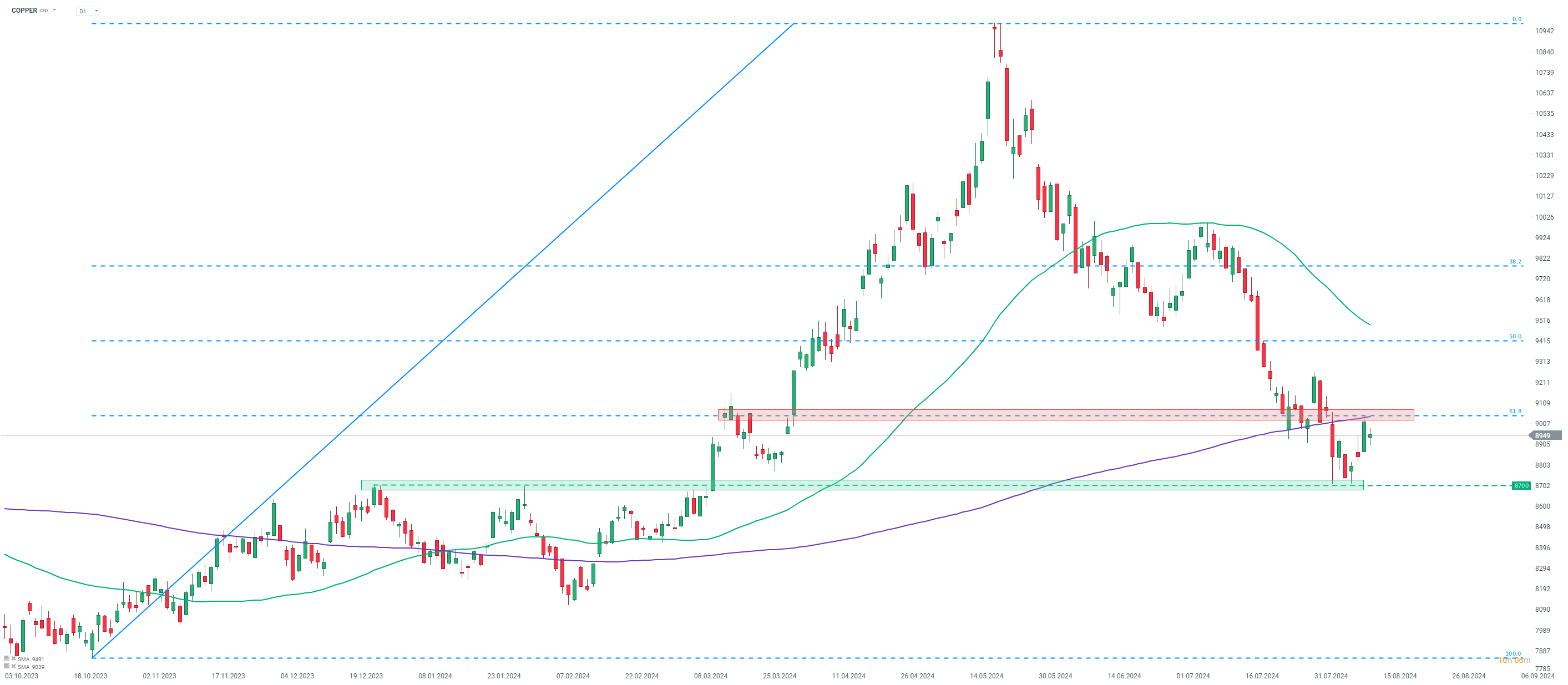 Recent rebound on the COPPER market looks to have been halted by the 9,050 resistance zone, marked with 200-session moving average (purple line) and 61.8% retracement of the upward move launched in late-2023. If monthly activity data from China scheduled for this week confirms weakness of the Chinese economy, COPPER may generate another leg lower in the ongoing downtrend. Source: xStation5