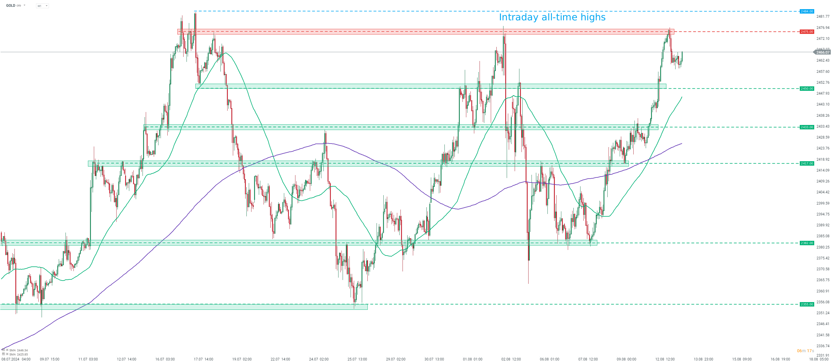 GOLD continued to rally on Monday amid still-tense situation in the Middle East, and tested $2,475 per ounce resistance zone. Bulls failed to push the price above, and a small pullback can be observed today. However, should US CPI data surprised to the downside this week, another test of the $2,475 area cannot be ruled out. Note that intraday all-time highs can be found less than 1% above current market price! Source: xStation5