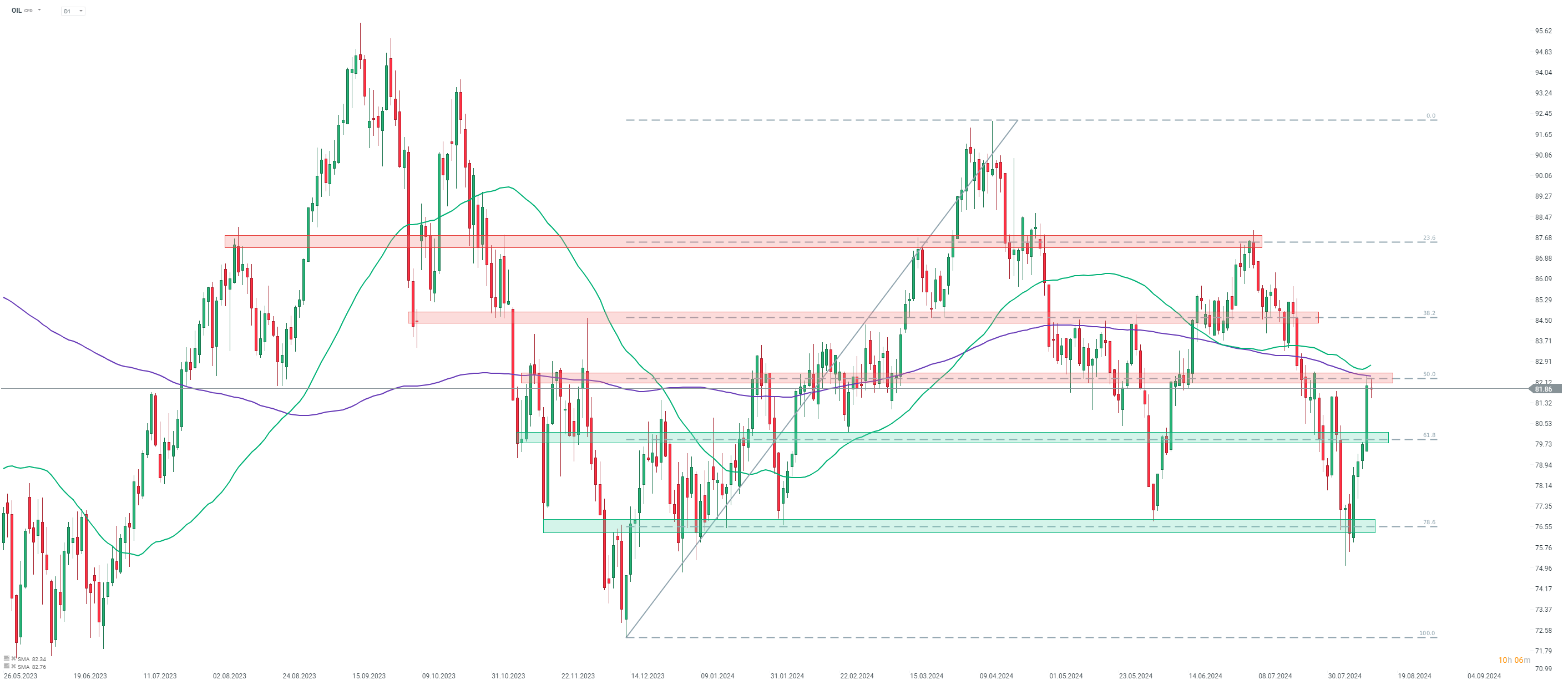 Brent (OIL) bounced around 9% off the intraday lows reached on Monday last week. Price tested $82 per barrel resistance zone yesterday, marked with 200-session moving average and 50% retracement of the upward move launched in late-2023. Fears of Middle East escalation are driving oil price now, with investors looking past demand growth forecast cuts by OPEC and IEA. Source: xStation5