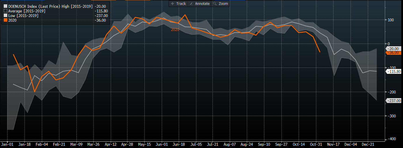 Decline in the natural gas stockpiles is currently bigger than 5-year range - further decline will be a warning signal for sellers