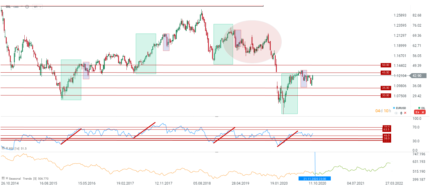 Oil prices rallied on positive vaccine news. Nevertheless, in case demand recovery stalls in the next couple of months, prices may be set to experience similar consolidation to the one from the second half of 2019 (marked with red on the chart above). Source: xStation5