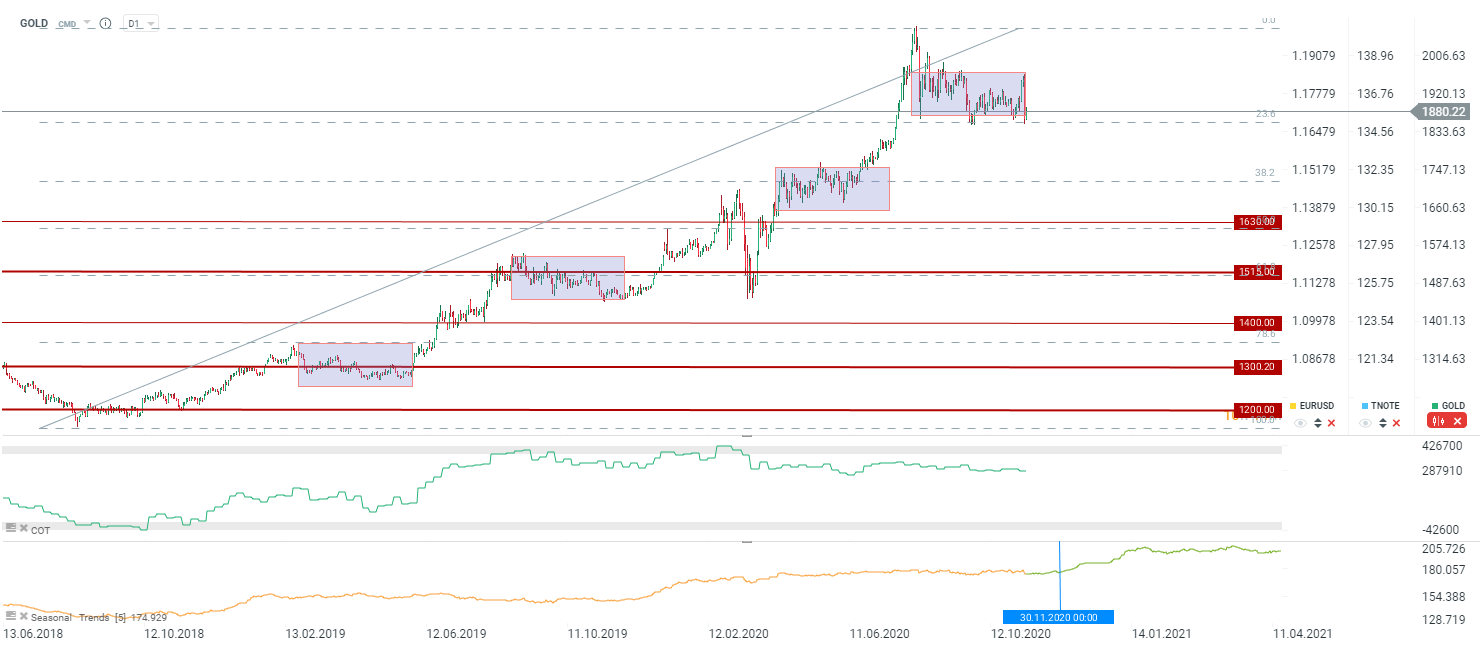 Gold price remains stuck in consolidation range. We expect that such a situation may continue in the coming weeks. Seasonal price jump should take place in the December-January period. Source: xStation5