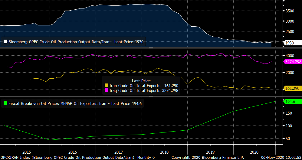 Oil production in Iran (top chart) is at the lowest level in decades. Output decline below pre-nuclear deal levels following US sanctions. Exports (middle chart, yellow line) are extremely low. Exports sat at 2mbpd when the nuclear deal was in effect. Meanwhile, break-even price for Iranian budget is $195 per barrel. Source: Bloomberg
