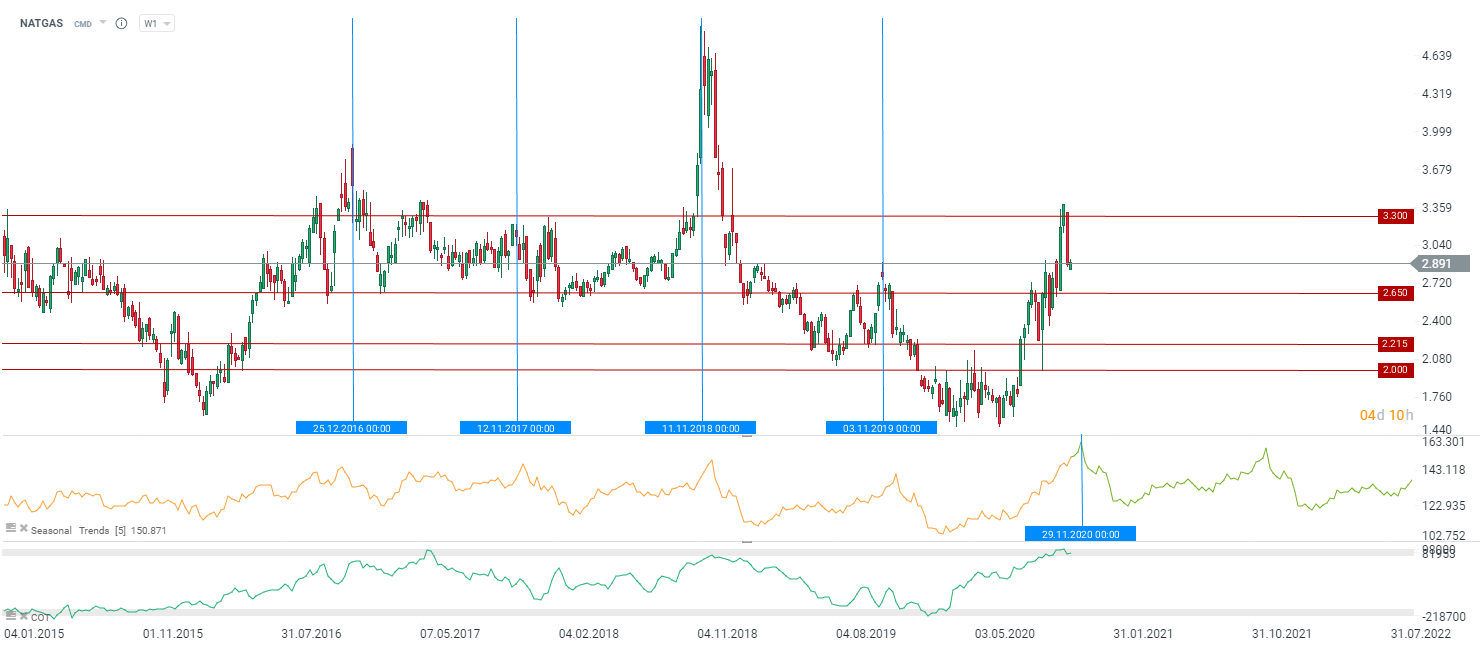 In theory, natural gas prices should be past their seasonal peak already, what coincides with extreme positioning. Traders should keep in mind that futures will roll over next week producing a 10-20 cent price gap. Source: xStation5