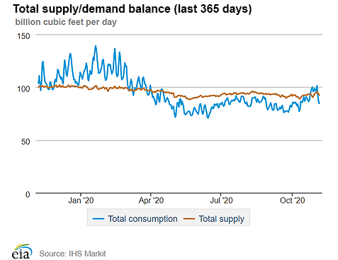Natural gas consumption dropped below daily available supply hinting that stockpiles may start to increase soon. Source: EIA, IHS Markit
