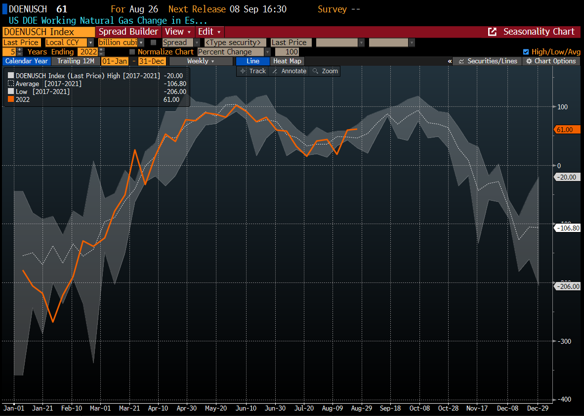 US natural gas stockpiles increased above the 5-year average recently. Changes in US stockpiles are in-line with seasonal patterns. Source: Bloomberg