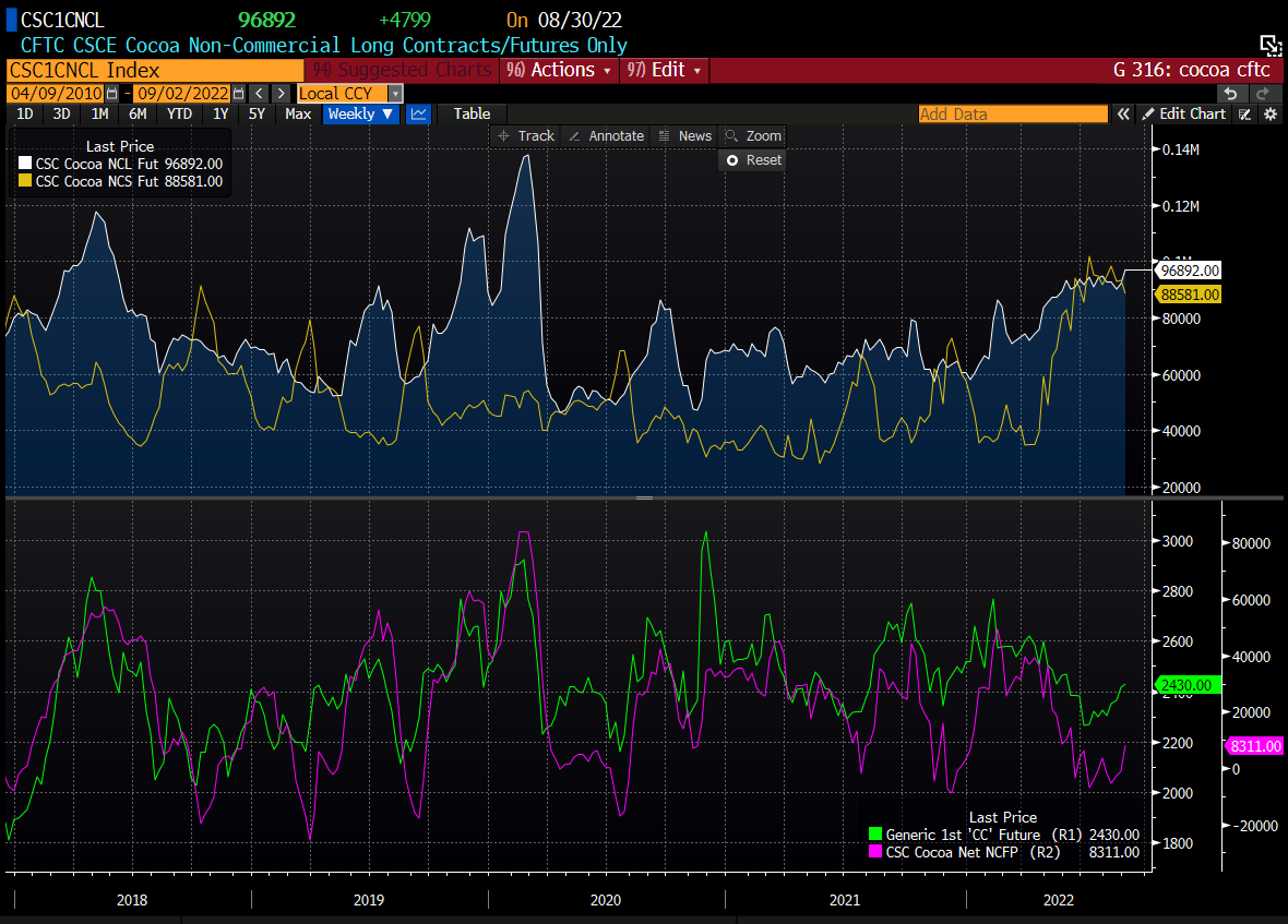 Net speculative positioning on cocoa starts to rebound but the number of open short positions remains extremely high compared to recent years. Source: Bloomberg