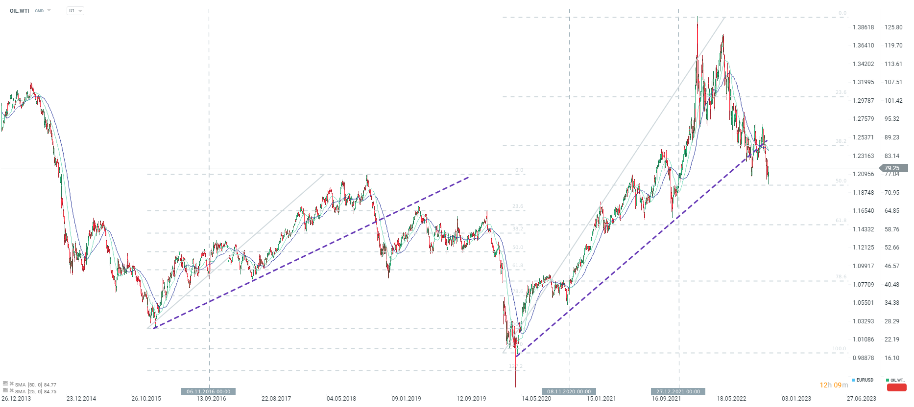 WTI prices dropped to the lowest level since December 2021. Prices bounced on hopes that the Chinese economy is heading for a reopening. However, the future outlook for oil will depend on how stable demand is, how the Russian oil embargo is implemented and whether OPEC+ will decide to cut output further. Source: xStation5