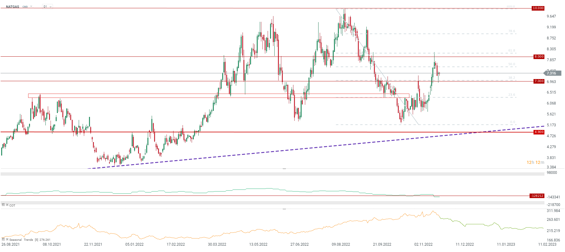 NATGAS pulled back at the end of a previous week amid forecasts of mild weather in the US in the coming days. On the other hand, price found support in the $7 per MMBTu area. Should temperatures drop significantly, one cannot rule out the possibility of prices spiking back above $8 per MMBTu. Source: xStation5