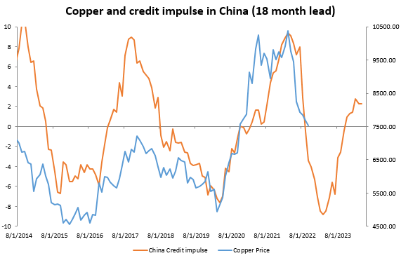 Chinese credit impulse continues to rebound and is in positive territory already. However, as data is an 18-month leading indicator, copper price may be set for some weakness before situation improves