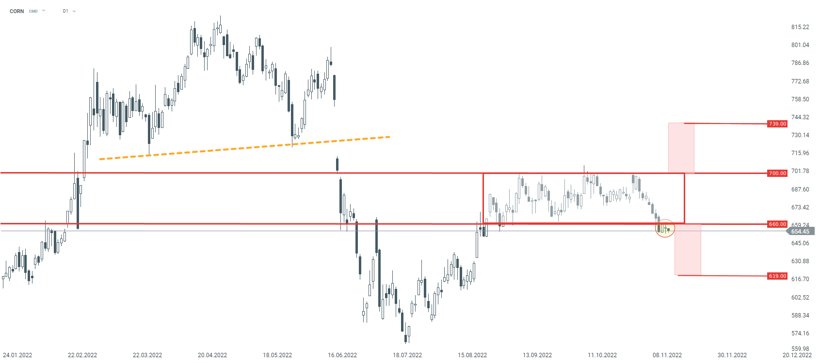 CORN dropped below the lower limit of a recent trading range in the 660 area. Downside breakout from the trading range may pave the way for a drop to as low as 619. Source: xStation5