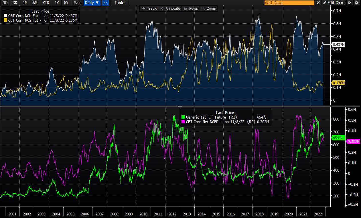 Net speculative positioning on corn dropped recently but changed was mostly in-line with seasonal patterns. Source: Bloomberg