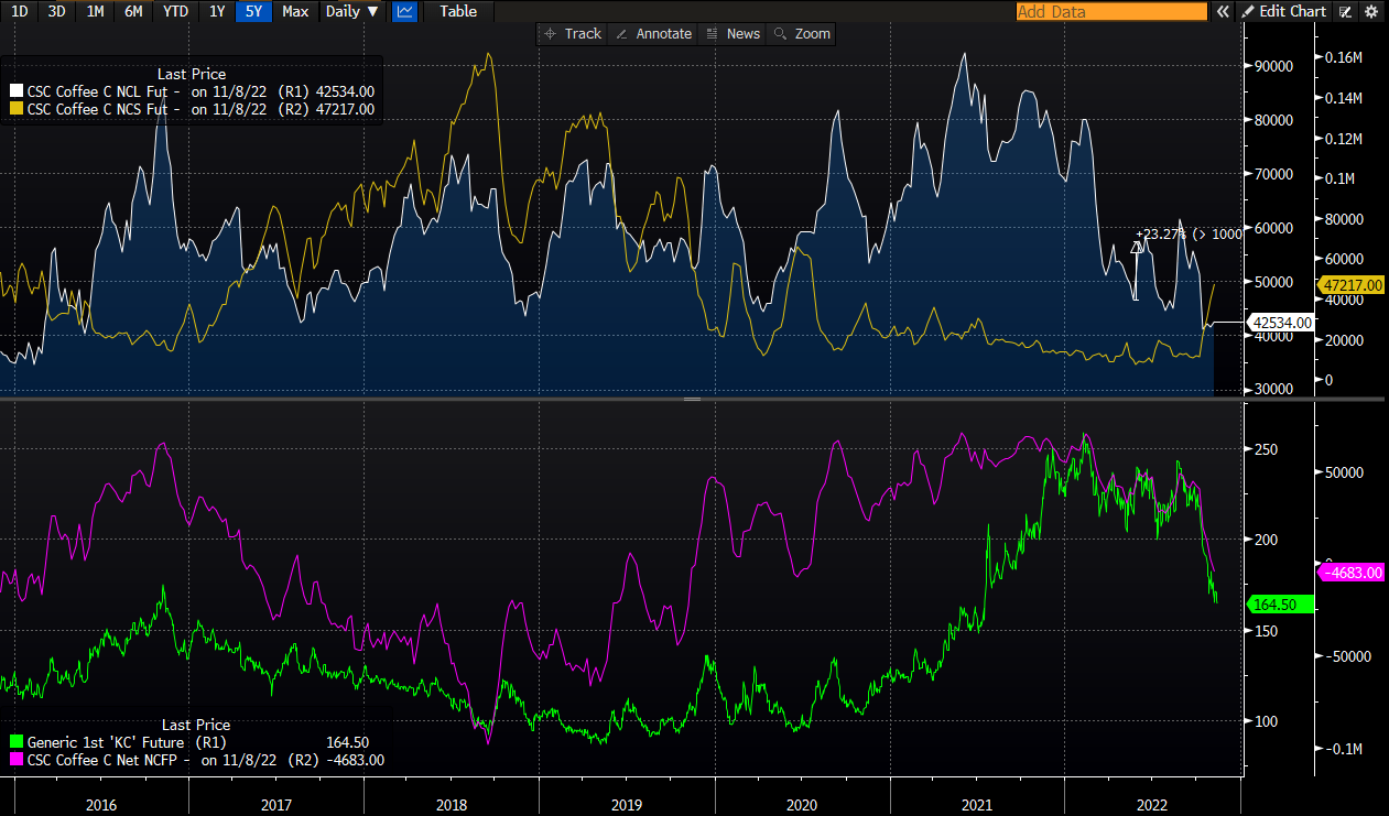 Net speculative positioning on coffee continues to drop as coffee price shows further weakness. A big jump in the number of open short positions pushed net positioning back into negative area