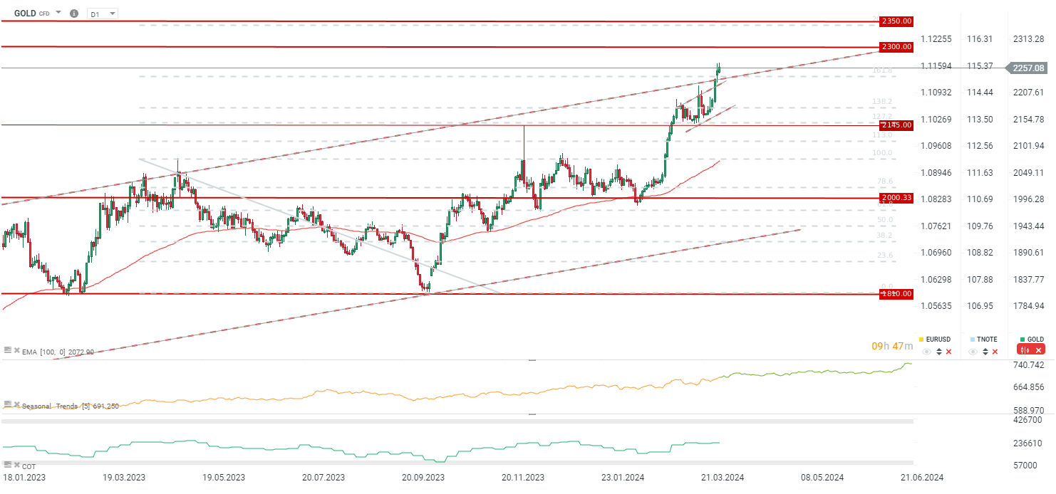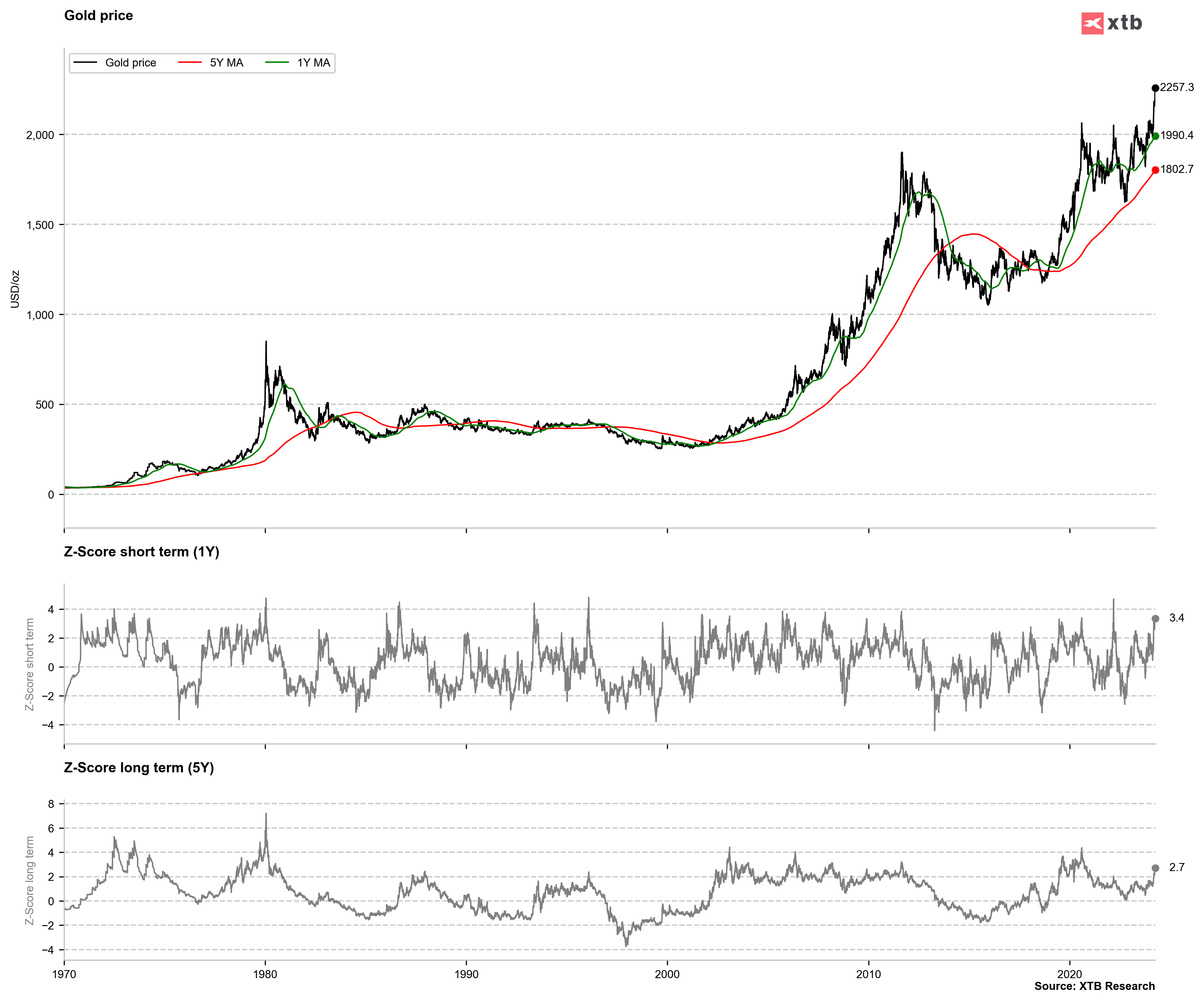 Gold is breaking through the upper limit of the short-term and long-term channel. Seasonality suggests further increases in the coming week. The positioning indicator shows slight overbought conditions over the past year, but at the same time, it does not indicate overvaluation in the long term. Source: xStation5