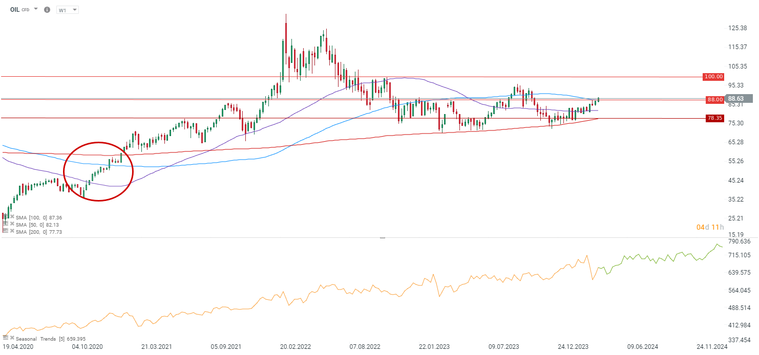 Brent price is surpassing the 50- and 100-period averages. Historically, when these averages were breached, oil prices continued to rise. The increase from the breach of the 100-period average (blue) was over 30%. Seasonality suggests upward trends until mid-year. Source: xStation5