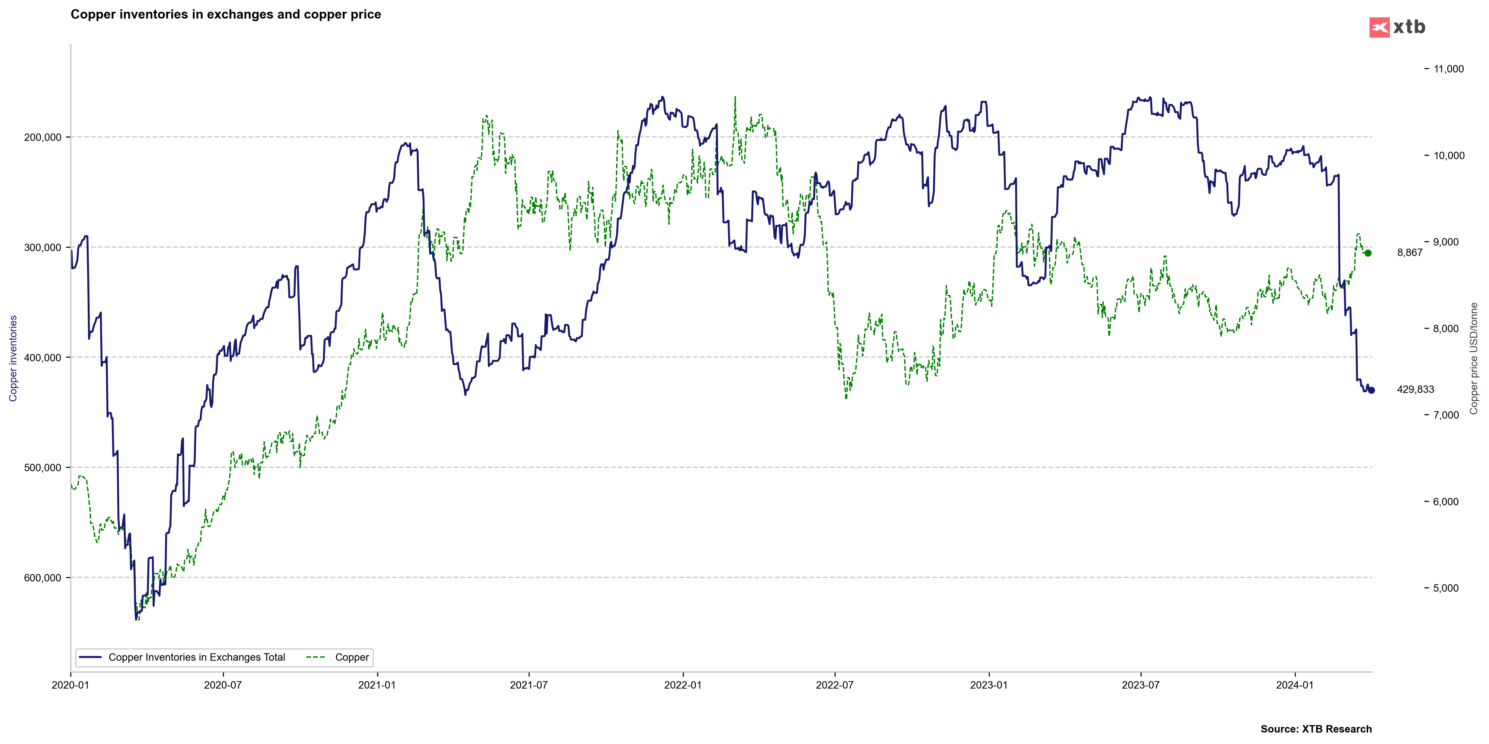 Inventories on major exchanges have increased quite significantly recently, with Chinese inventories hitting the highest levels since 2020. Although higher inventories should be negative for prices, we observe upward pressure, similar to what happened in 2020 - then the local peak in inventories coincided with the price peak. Source: Bloomberg Finance LP, XTB