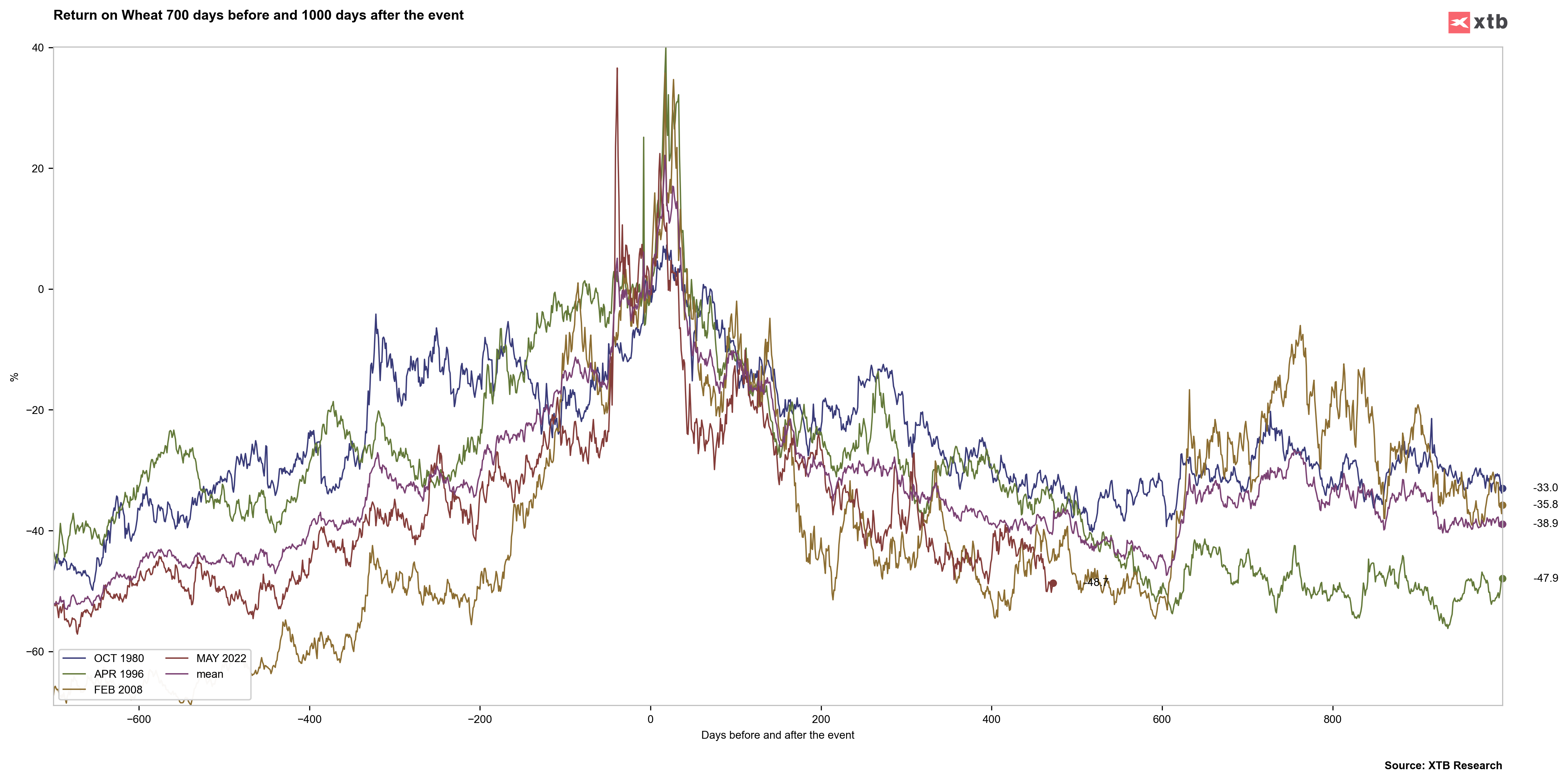 If wheat is currently in a similar downward cycle after reaching a historical peak, it may mean that downward pressure will persist for 600 sessions after the last historical peak. This would imply a possible rebound between the third and fourth quarter of this year, around the time of the harvest in the US. Source: Bloomberg Finance LP, XTB