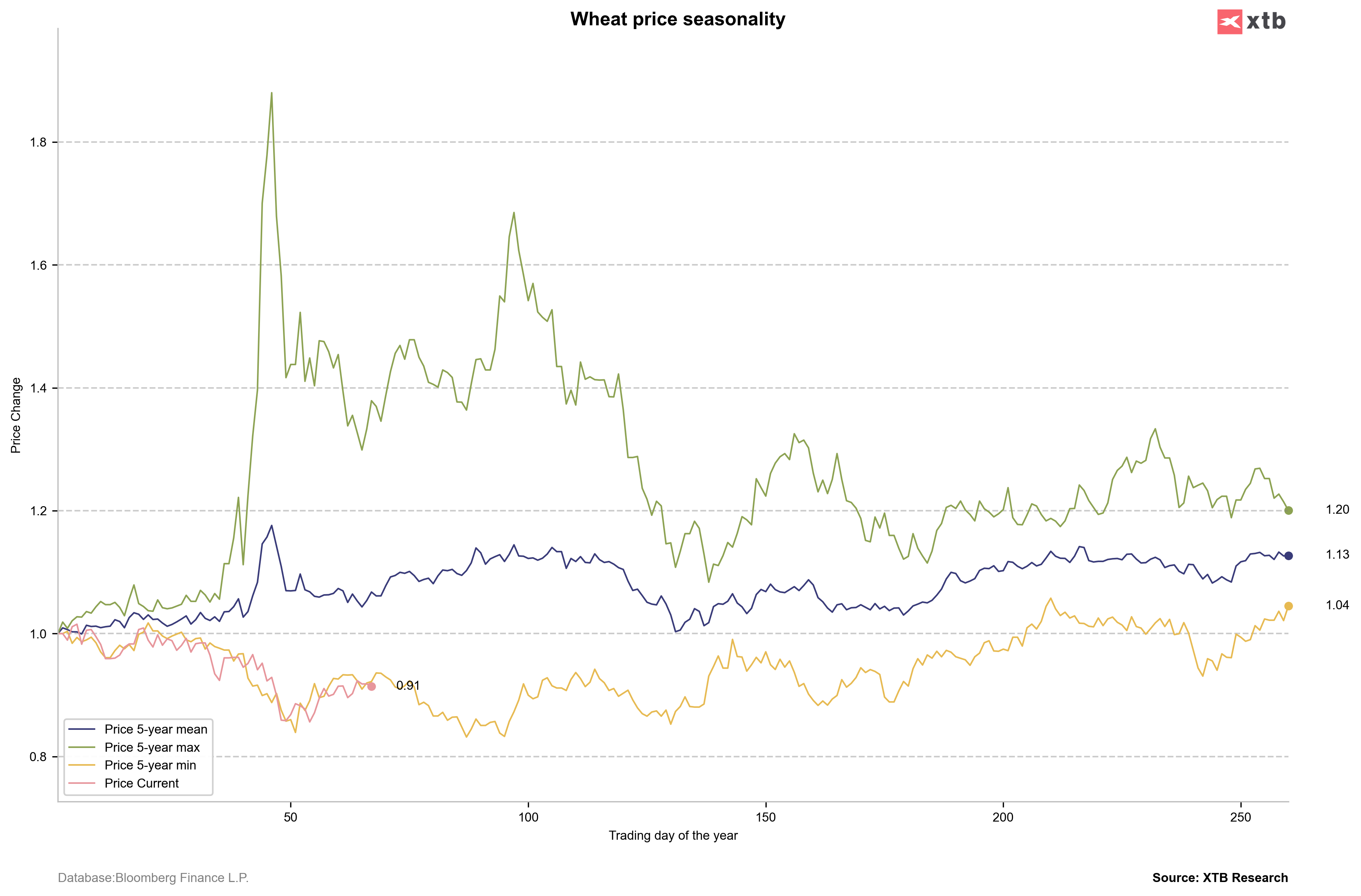 Wheat is currently moving in line with the worst price performance of the last 5 years, indicating that declines may deepen further. The strongest signals for local bottoms are expected in the middle of the year and at the end of the 3rd quarter. Source: Bloomberg Finance LP, XTB