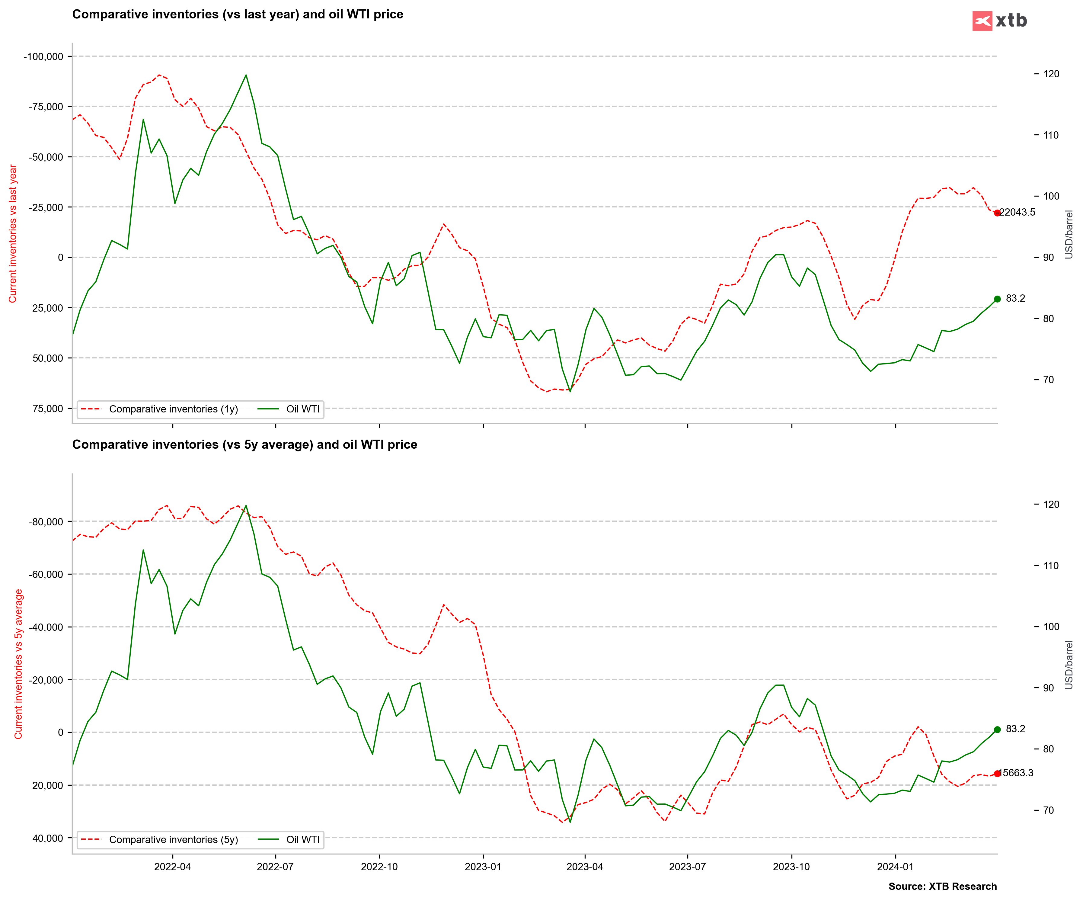 Compared to last year, current inventory levels indicate a deficit in the oil market, which may motivate further price increases. On the other hand, there doesn't seem to be a deficit compared to the 5-year average inventory. Source: Bloomberg Finance LP, XTB.