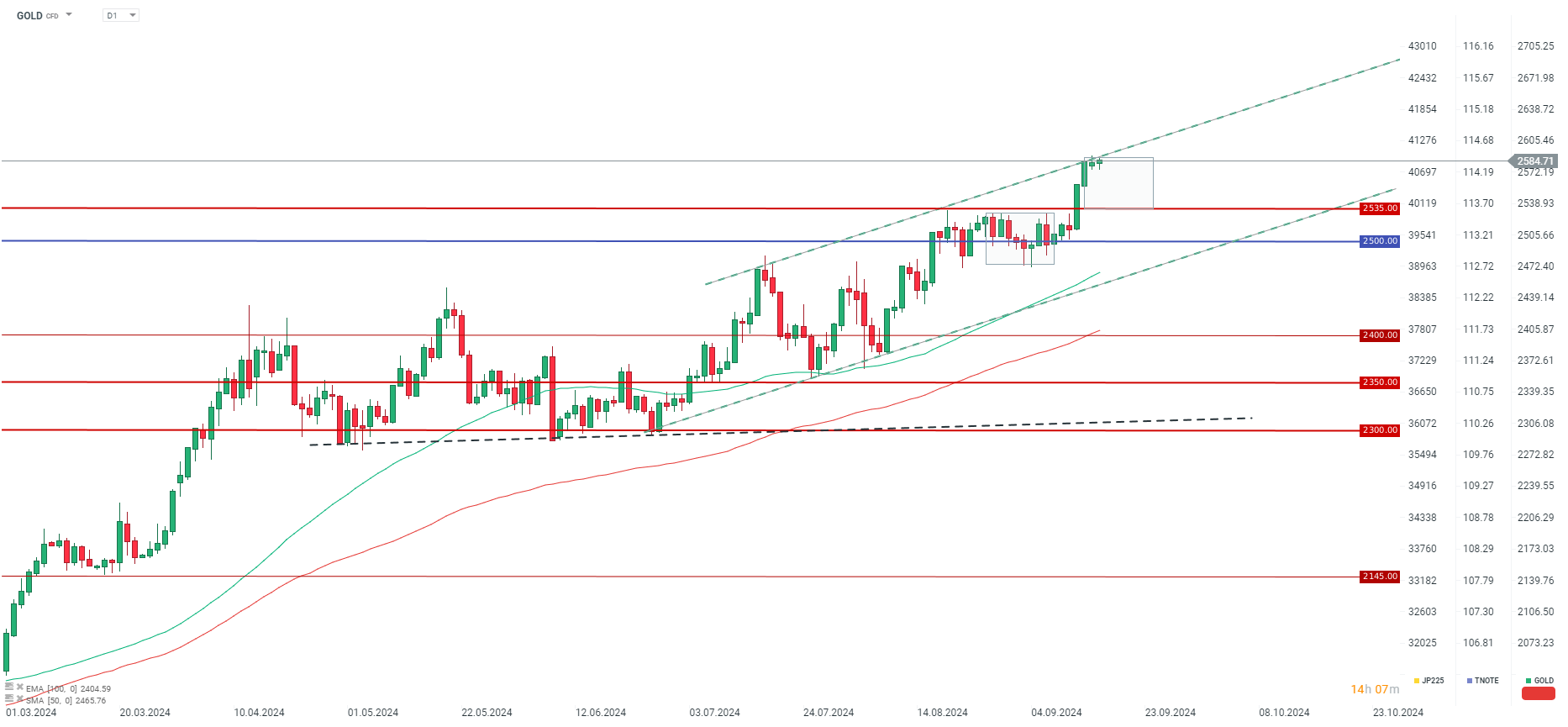 Gold is currently testing an important place in the form of the upper limit of the upward trend channel. If the test was the start of a correction, an important place of support could be around $2535 per ounce. Source: xStation5