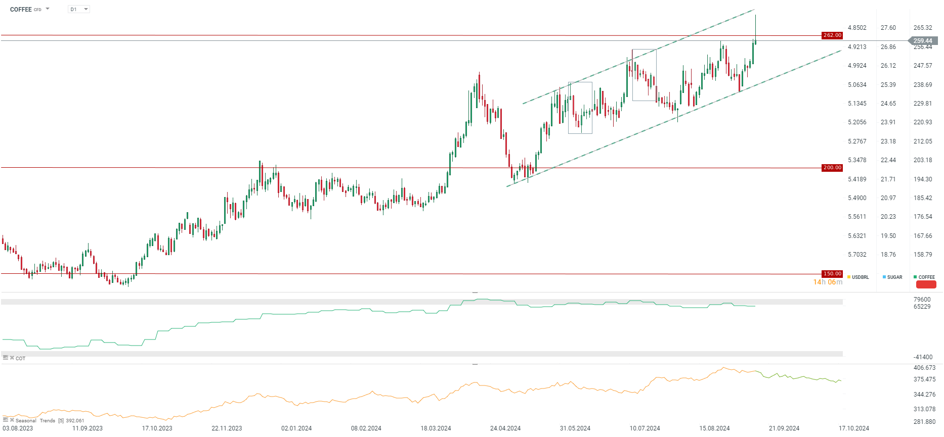 Coffee capped gains after a strong session earlier this week, but continued weather problems in Brazil and Vietnam could lead to a revision of crop forecasts for the 2024/2025 season. It may be that the sizable surplus forecast will be fully reduced. Source: xStation5