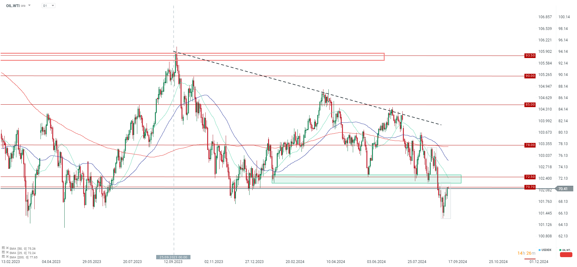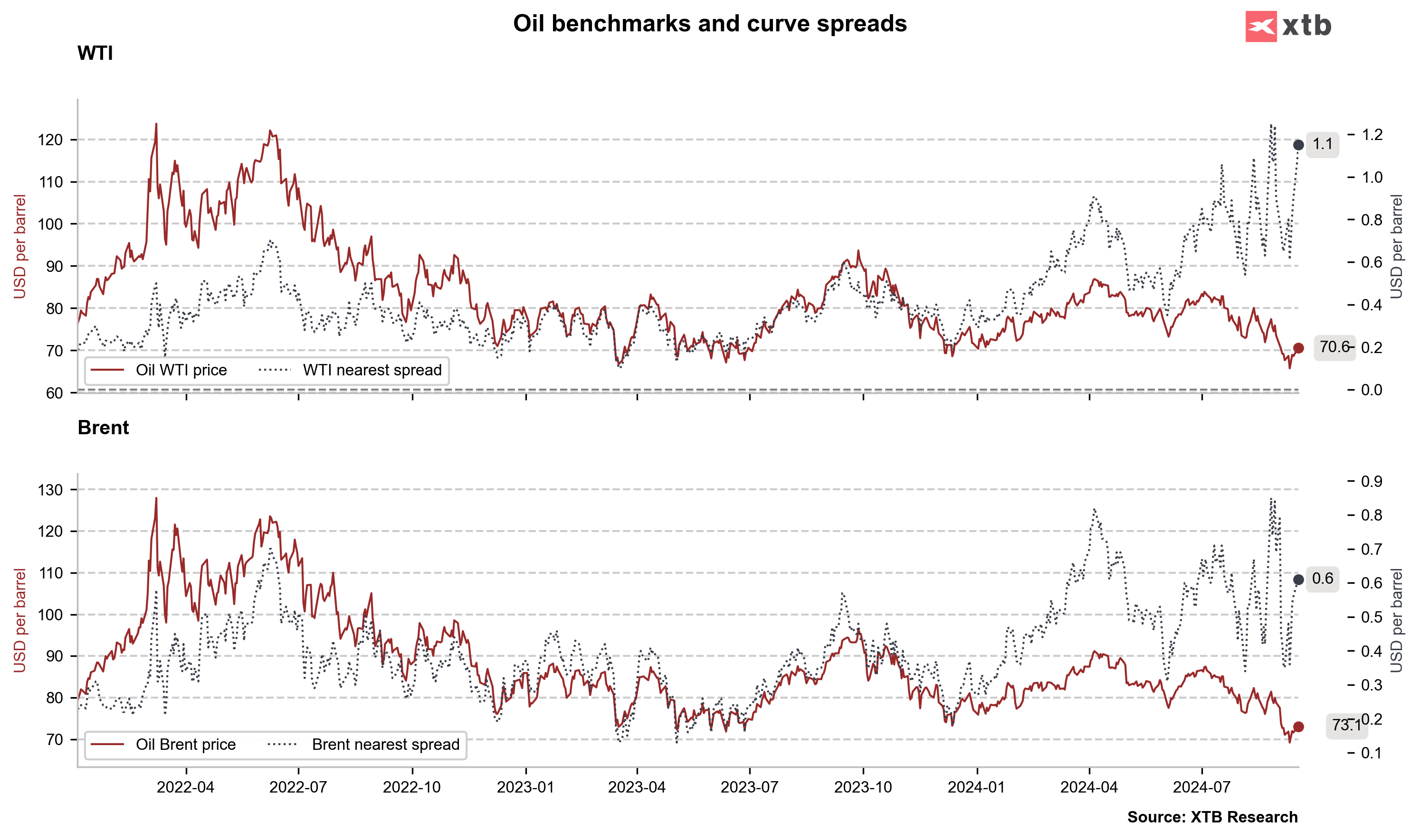 We are seeing a lot of mixed signals for WTI and Brent Crude Oil. Nevertheless, the current behavior of the WTI oil price may suggest an attempt to rebound to the $71.5 per barrel level. A rise above this level would indicate a possible breakout from the downtrend. Source: xStation5