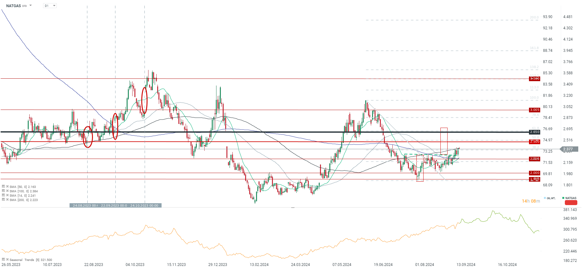 Gas is currently testing the 100-period average. Of course, it is worth keeping in mind the rollover, which will take place today after the session and will be around 10%. The spike will likely lead to a test of the range of the oRGR formation. Another thing worth noting is the massive gap. Last year, the September gap was not closed until December, while the October gap was not closed until November. Source: xStation5
