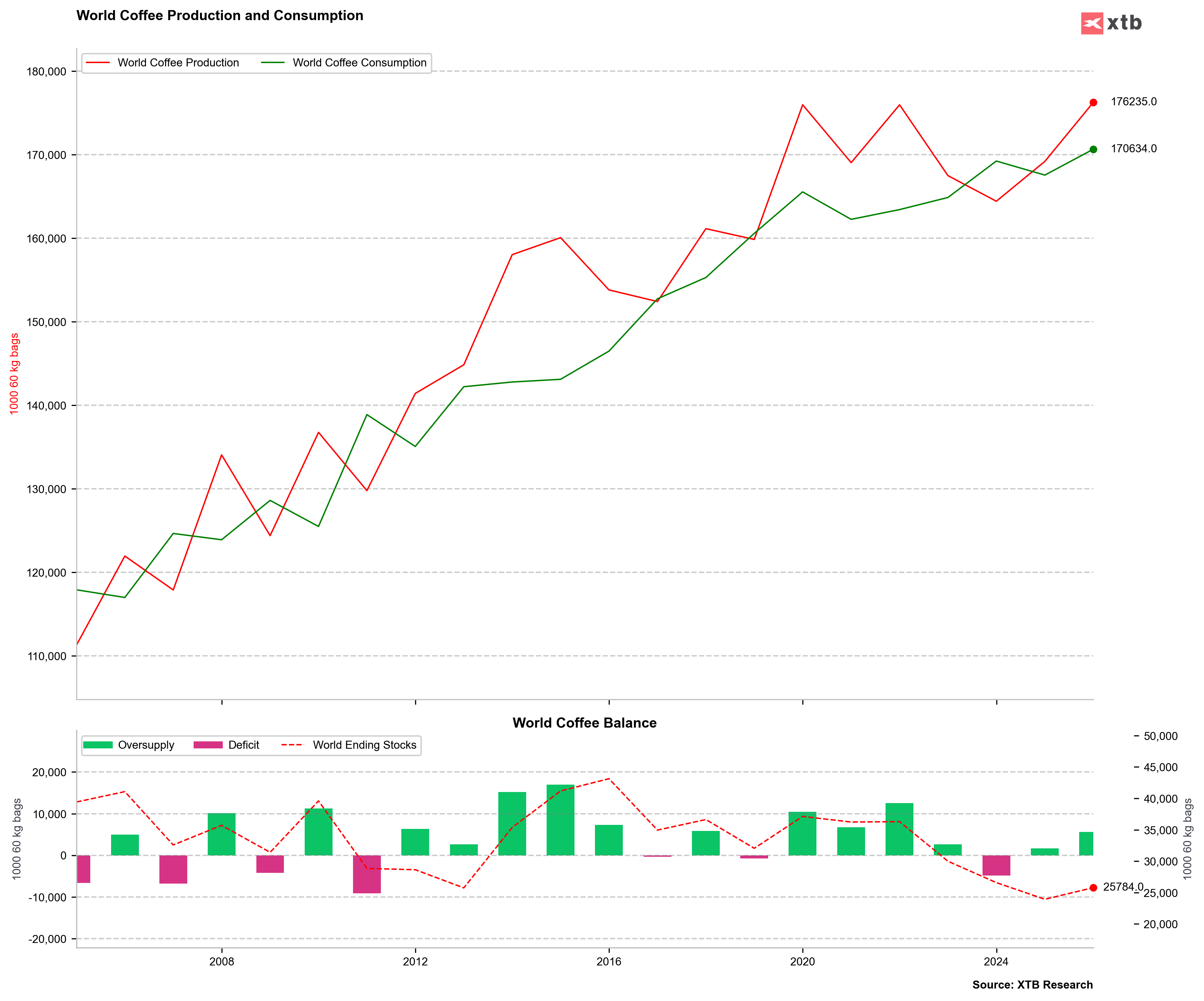 Currently, we are expected to have a sizable oversupply in the 2024/2025 season, due to the expectation of a sizable production rebound in Brazil. On the other hand, there is a good chance of a revision of these forecasts and also a reduction in the production outlook in Vietnam. Source: Bloomberg Finance LP, XTB