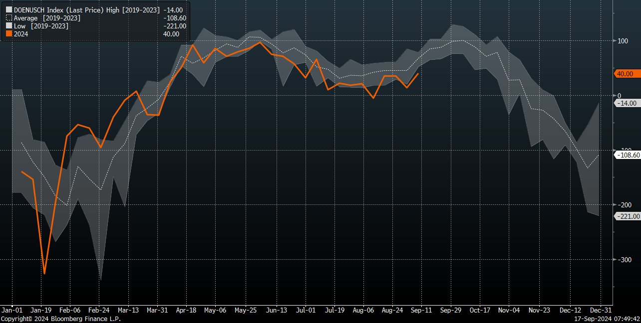 - We are again seeing a clear increase in backwardation, which is already over $1 in the case of WTI. In the case of Brent crude we do not see such a strong increase in backwardation
