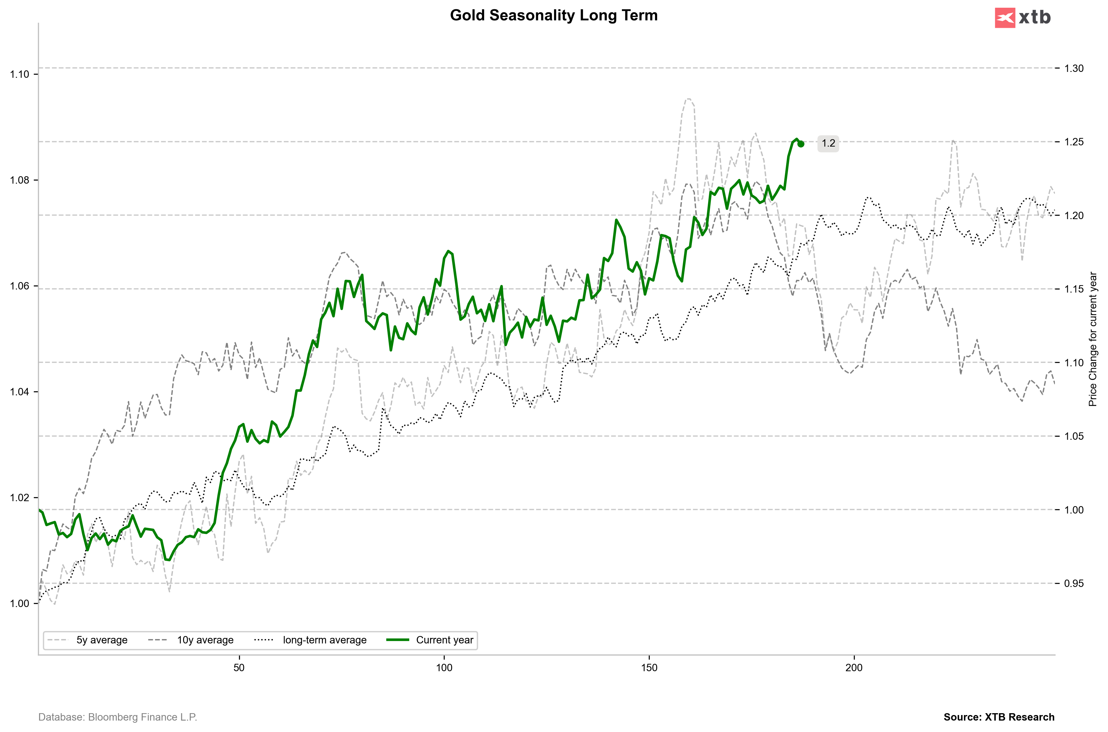 According to the 5-year seasonality, gold is near a potential average bottom, while the maximum behavior of the last 5 years suggests consolidation. Source: xStation5