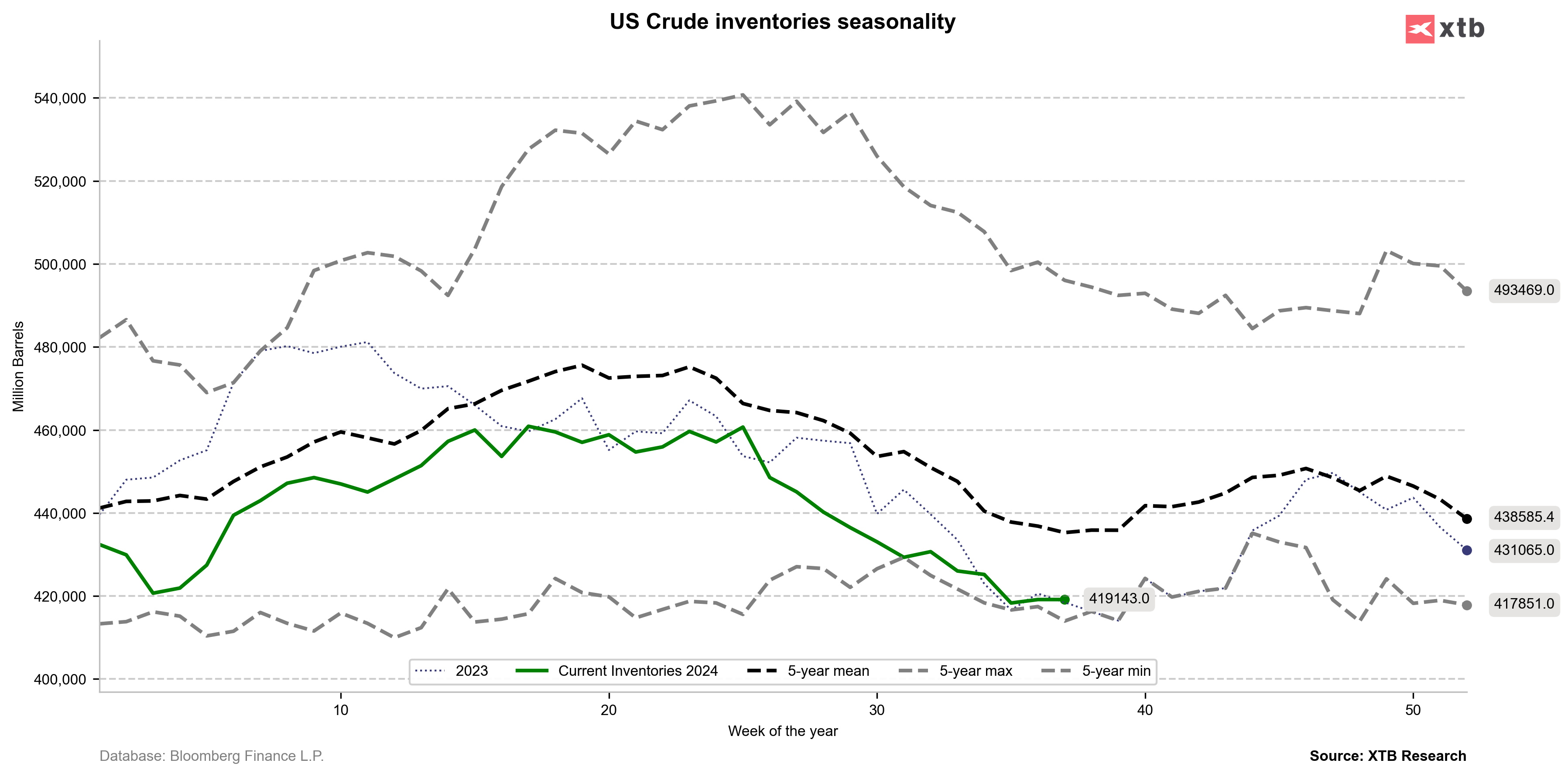 Crude oil inventories are currently at a 5-year low. The current behavior relative to averages and levels from a year ago will be important. Source: Bloomberg Finance LP, XTB