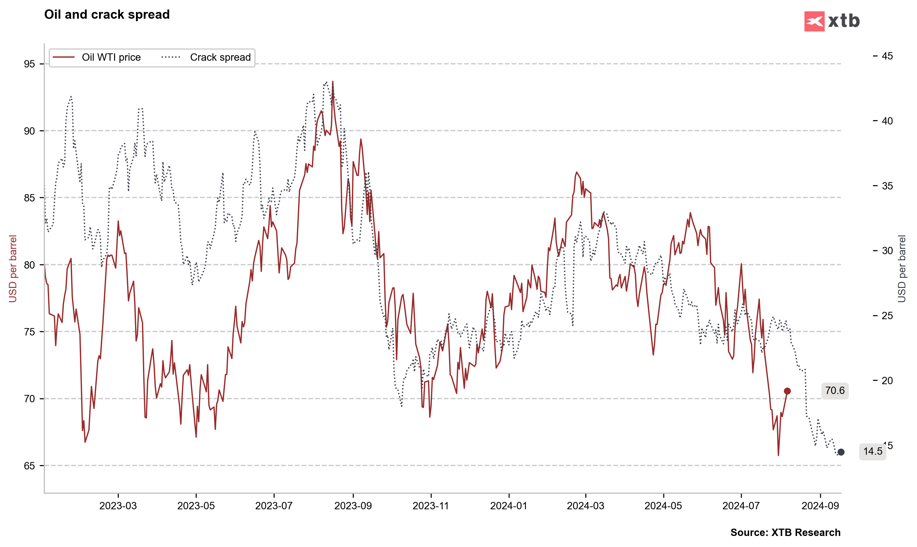 The crack spread does not justify a rebound in WTI oil prices. Nevertheless, the behavior of oil inventories may also lead to a crack spread rebound itself. Source: Bloomberg Finance LP, XTB