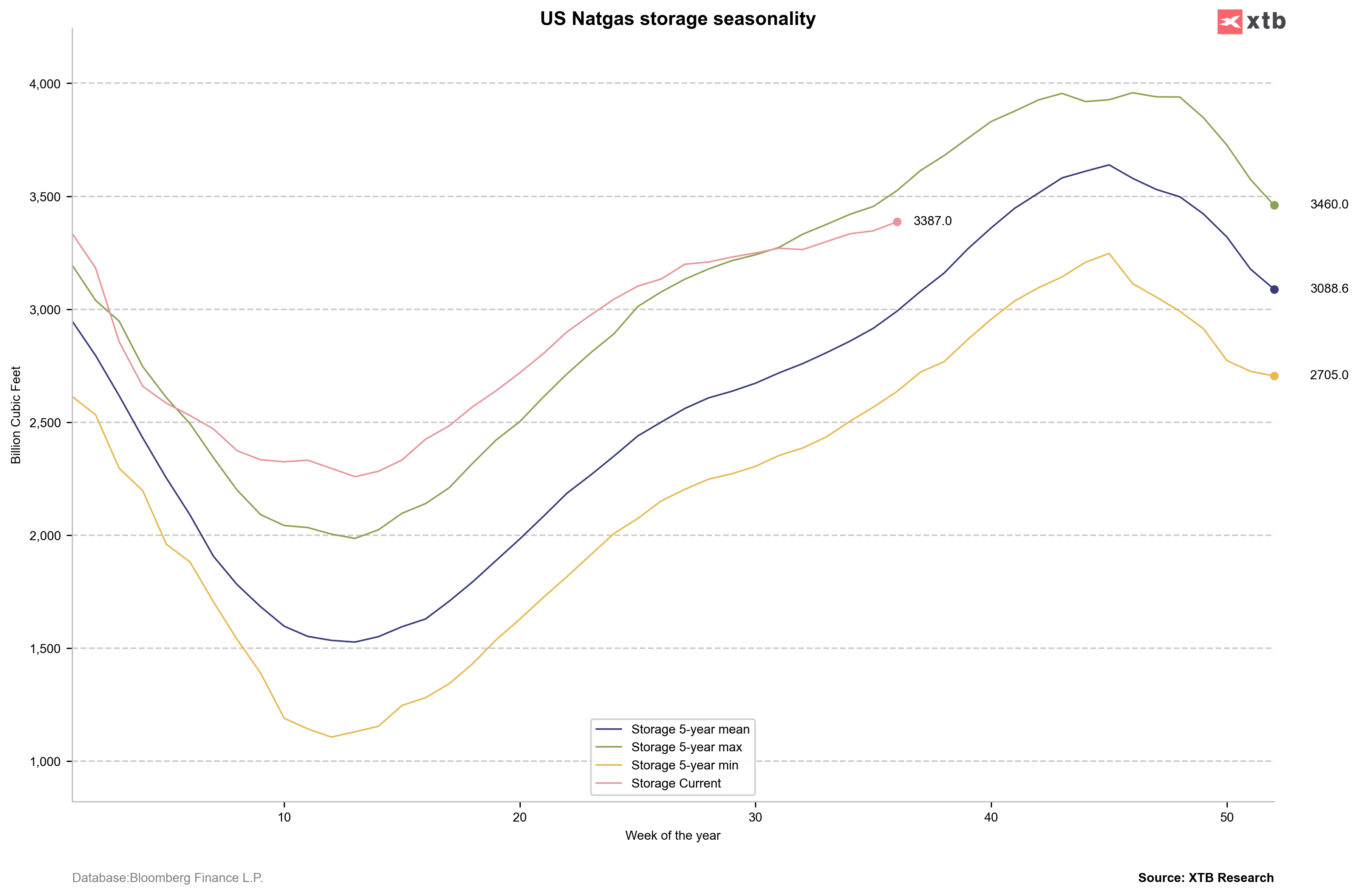 Increases in gas inventories in recent weeks have been noticeably lower than seasonality would suggest. This suggests that upward pressure on gas prices should continue. Source: Bloomberg Finance LP, XTB