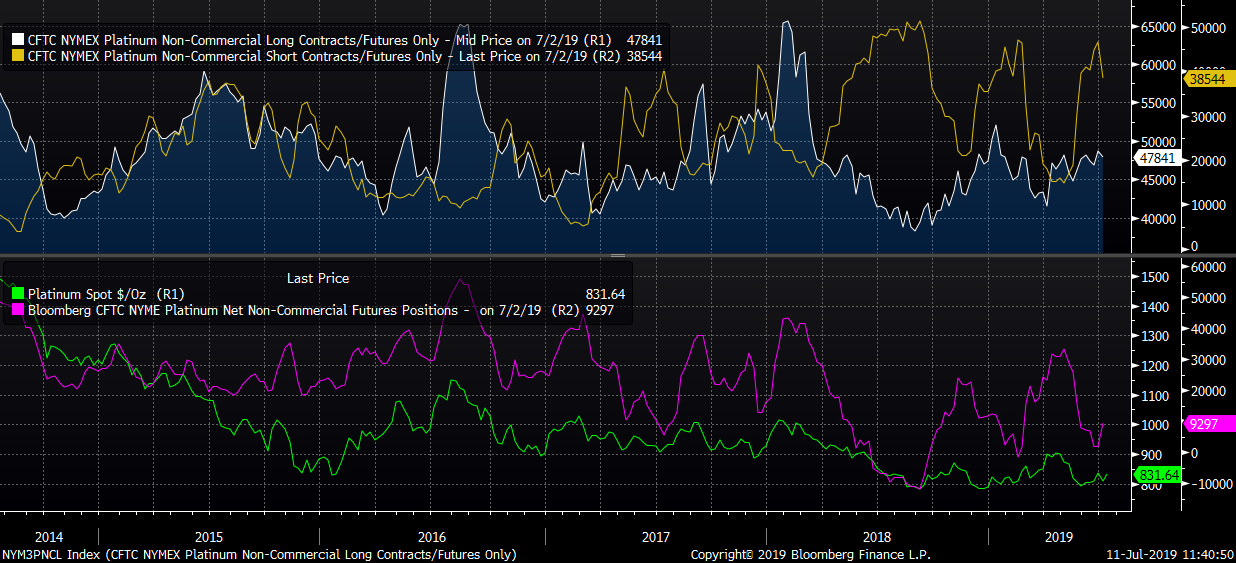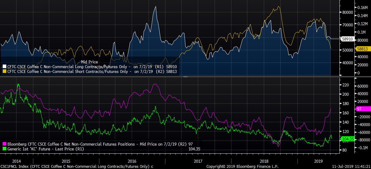 The net positioning is the highest since 2017, however, longs have yet to bounce back. Source: Bloomberg