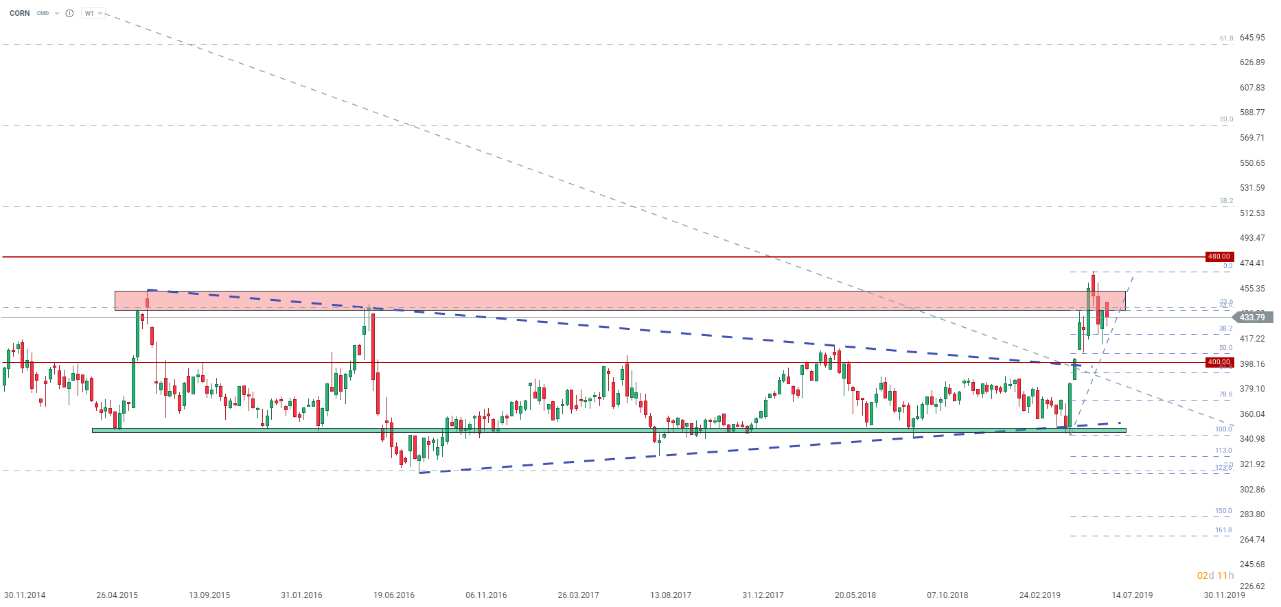 Corn keeps trading close to the crucial supply zone. Key, short-term resistance zone is localized at 440 cents per bushel while support can be found at 420 cents (38.2% Fibo level of the latest bounce higher). Source: xStation5