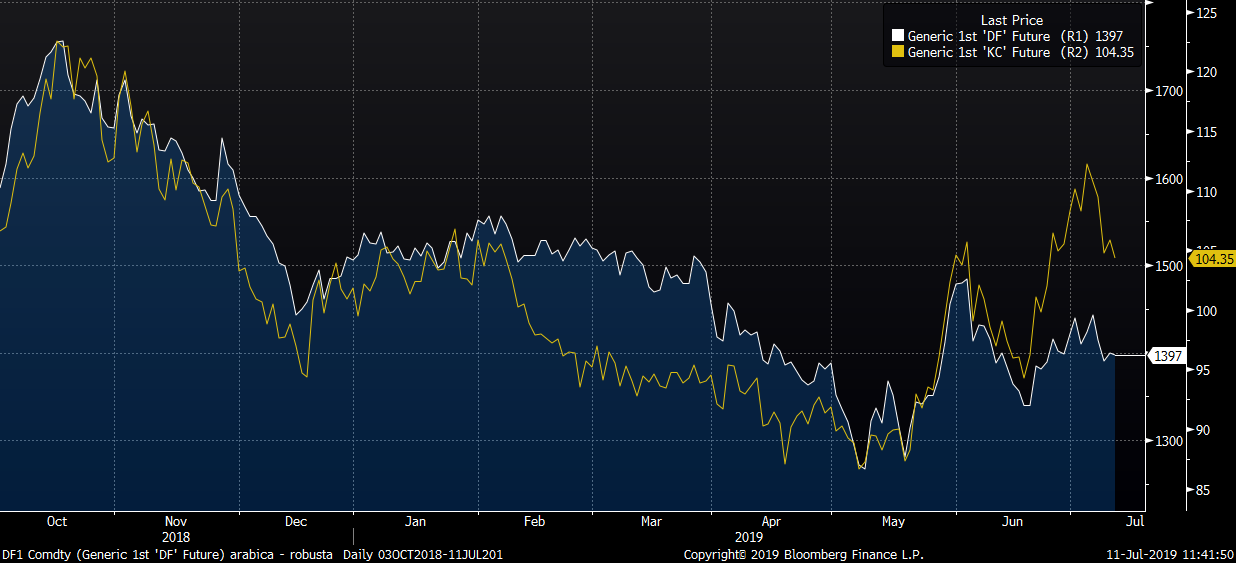 Arabica prices are well above Robusta prices due to frost’s concerns. Source: Bloomberg