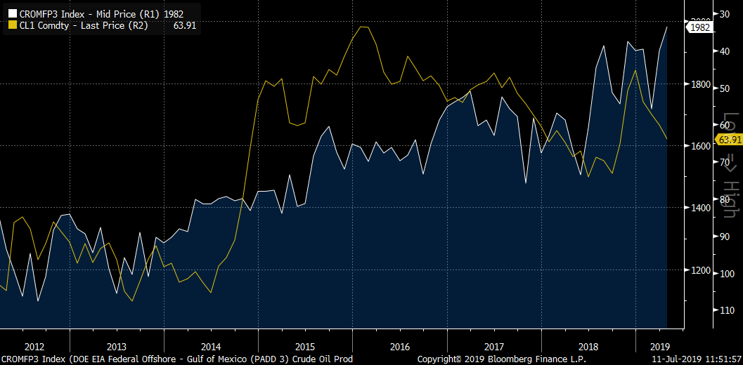 Oil production in the Gulf of Mexico has been at record highs recently and close to 2 million barrels per day. Hurricanes are likely to disrupt production and may see region’s output shrink by as much as 600k barrels. However, any disturbances should be temporary. Source: Bloomberg